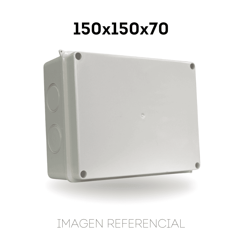 Caja estanca 150x150x70 mm para proteger empalmes eléctricos y dispositivos de control. Su diseño compacto y sellado IP65 la hace ideal para uso exterior.