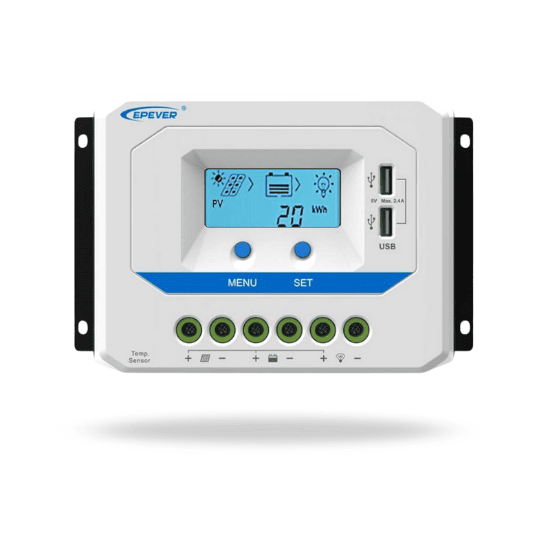Controlador de carga PWM para paneles solares 12/24/36/48V DC de 45A máx. y pantalla LCD, modelo VS4548AU, EPEVER. Compatible con paneles solares monocristalinos y policristalinos. Compatible con baterías AGM, GEL.